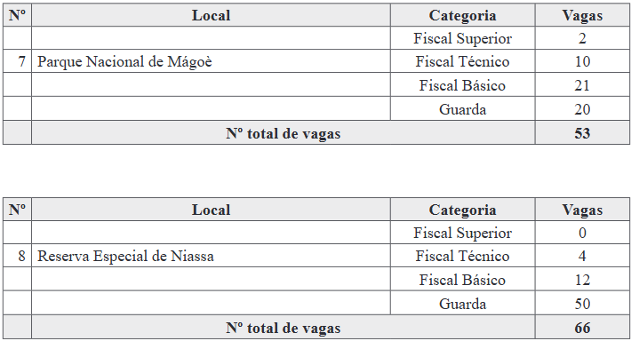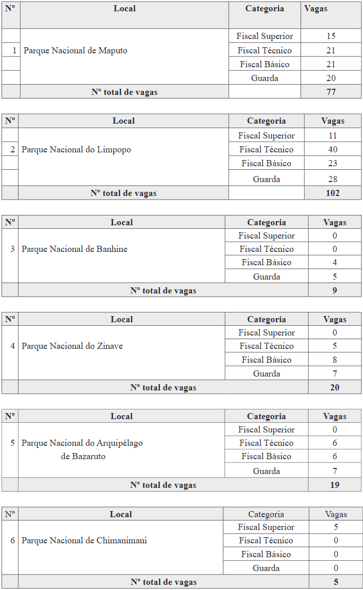 1. De acordo com o Despacho de 9 de Setembro de 2025, Sua Excelencia Ministro da Agricultura, Ambiente e Pescas, autorizou a abertura do concurso de admissao de 351 Guardas Florestais, vagas aprovadas no Decreto nº 17/2025, de 27 de Junho que estabelece regras de execução do Plano Económico e Social e Orçamento do Estado (PESOE). Nestes termos, ao abrigo do disposto na alínea f) do artigo 11 do Decreto n° 16/2022, de 29 de Abril, que ajusta as atribuições, competências, autonomia, gestão, regime orçamental, organização e funcionamento da Administração Nacional das Áreas de Conservação é publicado o presente aviso, conforme a tabela abaixo:
