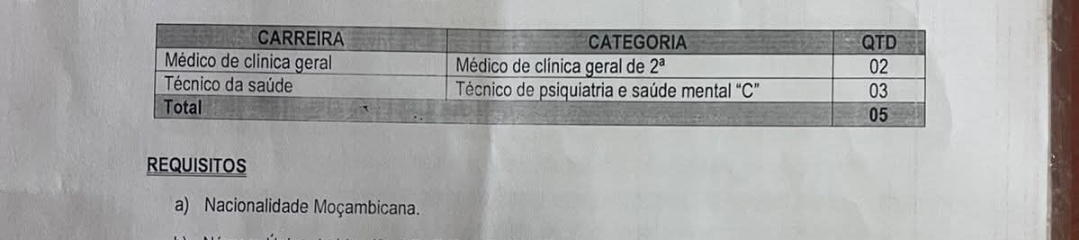 De acordo com o despacho de 06 de Março de 2026, de Sua Excelência Secretária de Estado na Provincia de Tete, foi autorizado a abertura do concurso público para o ingresso, nos termos do artigo 34, do Estatuto Geral dos Funcionários e Agentes do Estado (EGFAE), aprovado pela Lei nº 4/2022, de 11 de Fevereiro, conjugado com o artigo 4, do Regulamento do EGFAE, aprovado pelo Decreto nº 32/2023, de 08 de Junho, num prazo de 30 dias, contados a partir da data da publicação, para o preenchimento de 5 (cinco) vagas, nas carreiras de Regime Especial de Saúde Diferenciado e não Diferenciado (Médico de Clínica Geral e Técnico da saúde), com a duração de 3 (três) anos, para estas e as que vierem a existir, de acordo com a tabela abaixo mencionada.