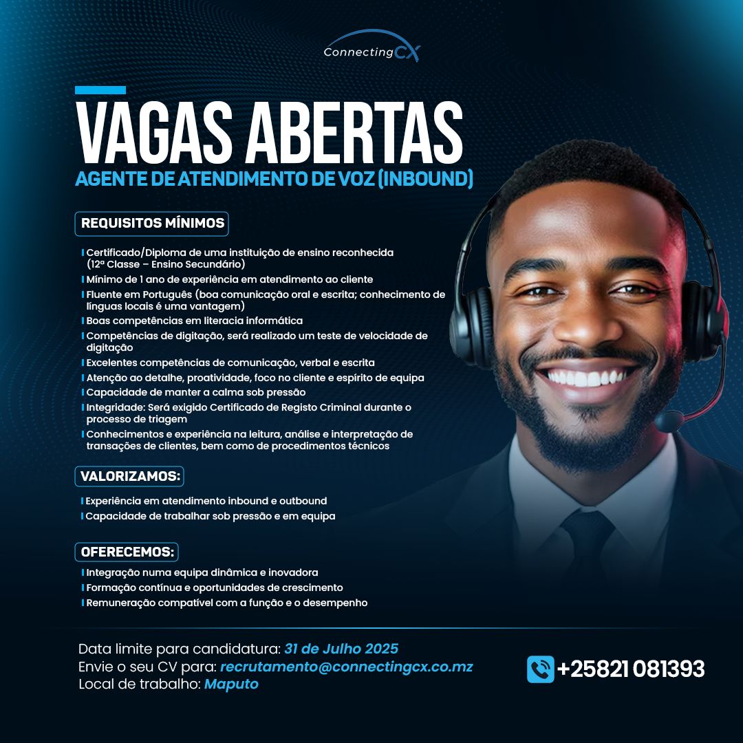 Para se candidatar a esta vaga envie seus detalhes por e-mail para recrutamento@connectingcx.co.mz