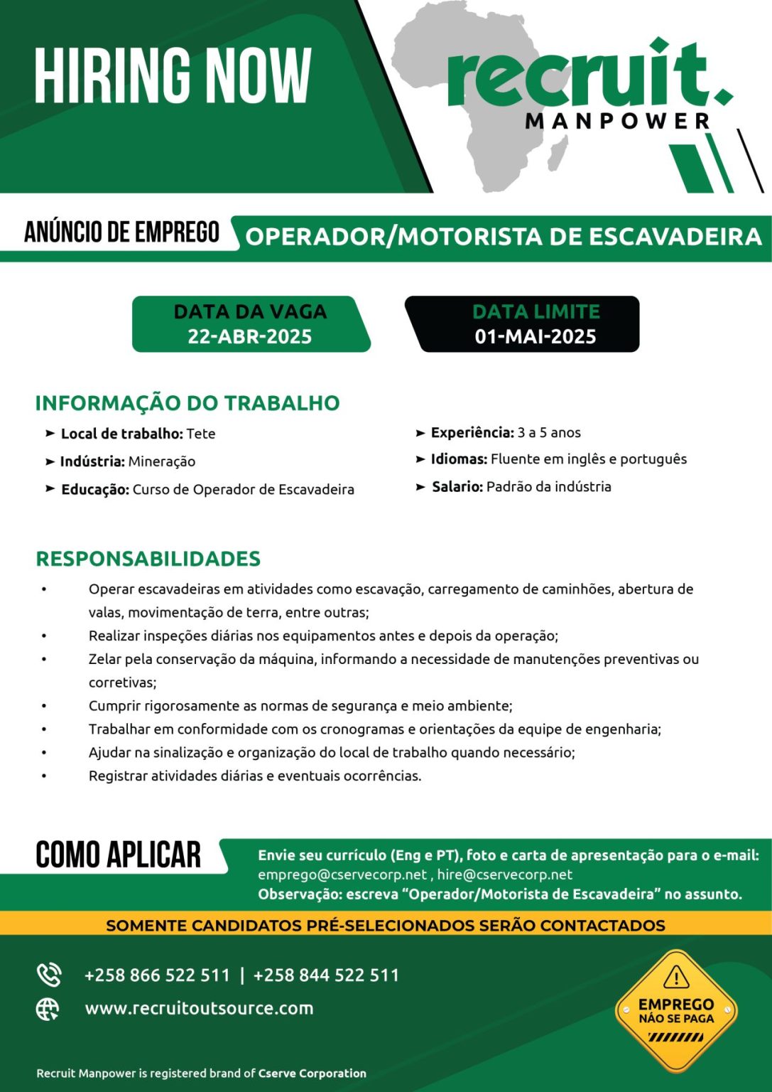 Nota: Por favor, escreva OPERADOR/MOTORISTA DE ESCAVADEIRA na linha de assunto.