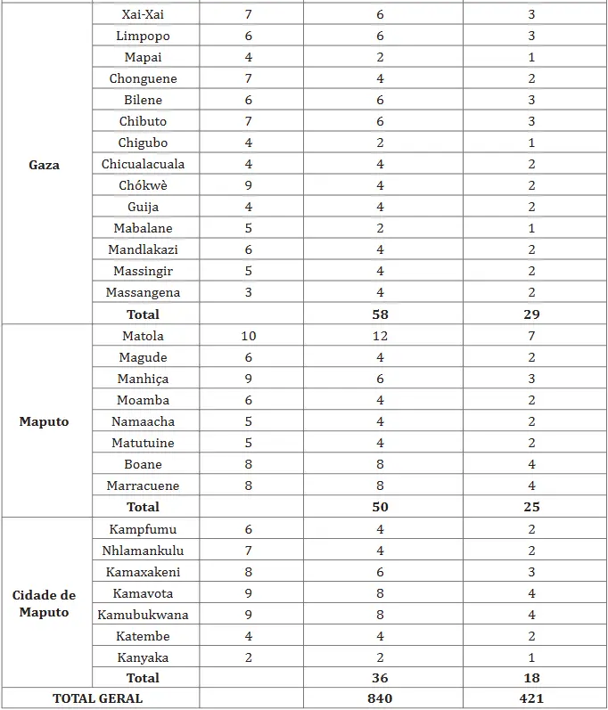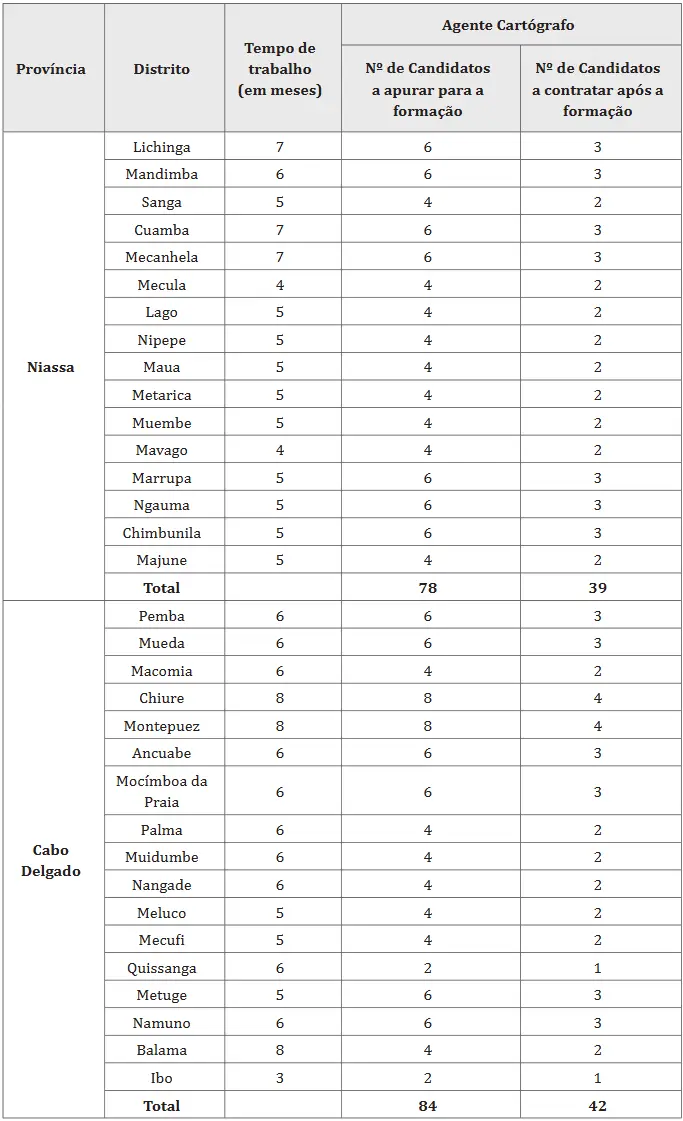contratação de 421 Agentes Cartógrafos, a nível nacional, no âmbito da actualização Cartográfica para o Censo 2027, conforme as tabelas abaixo:
